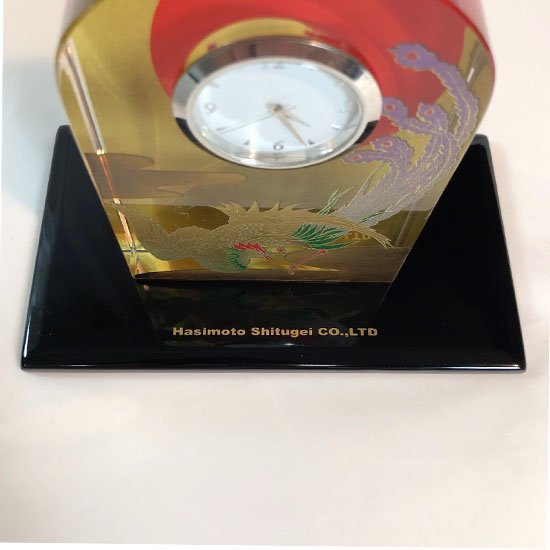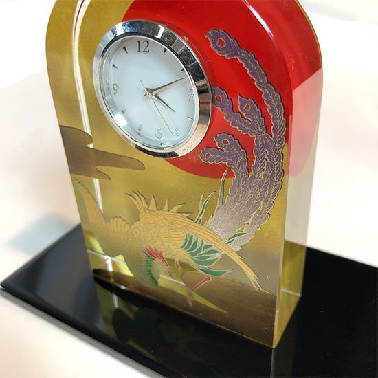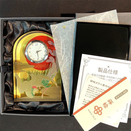 前後に奥行きのある蒔絵表現が特徴のガラス置き時計。透過率の高い光学ガラスの使用により、ガラスの前面と背面の両方から絵付けを行うことでこれまでにない画期的な表現が可能になりました。新しいテクノロジーと伝統工芸蒔絵が融合した高級感のある置き時計です。