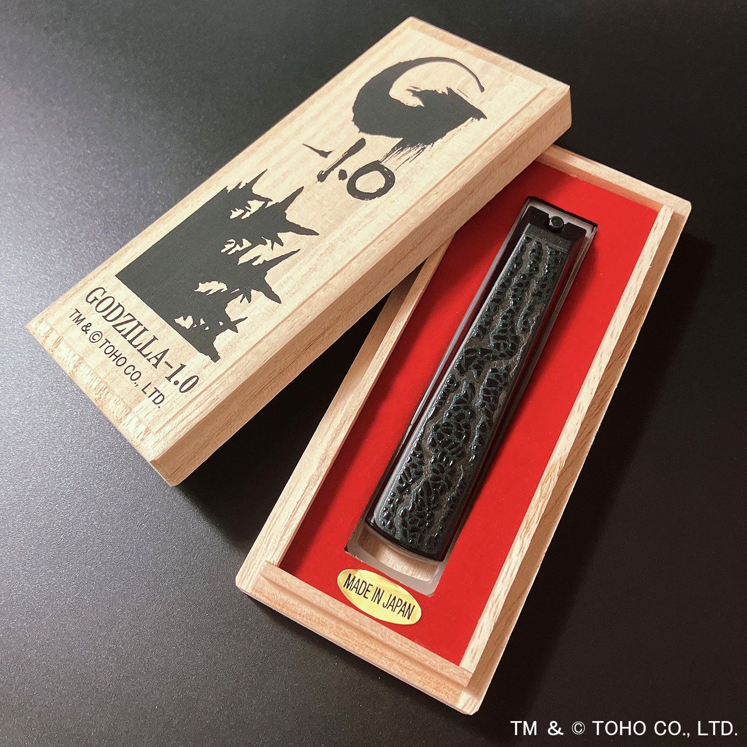 ゴジラの皮膚を表現するために「高蒔絵」の技法で再現し、ゴジラ(2023)に合わせた青みがかった色合いです。